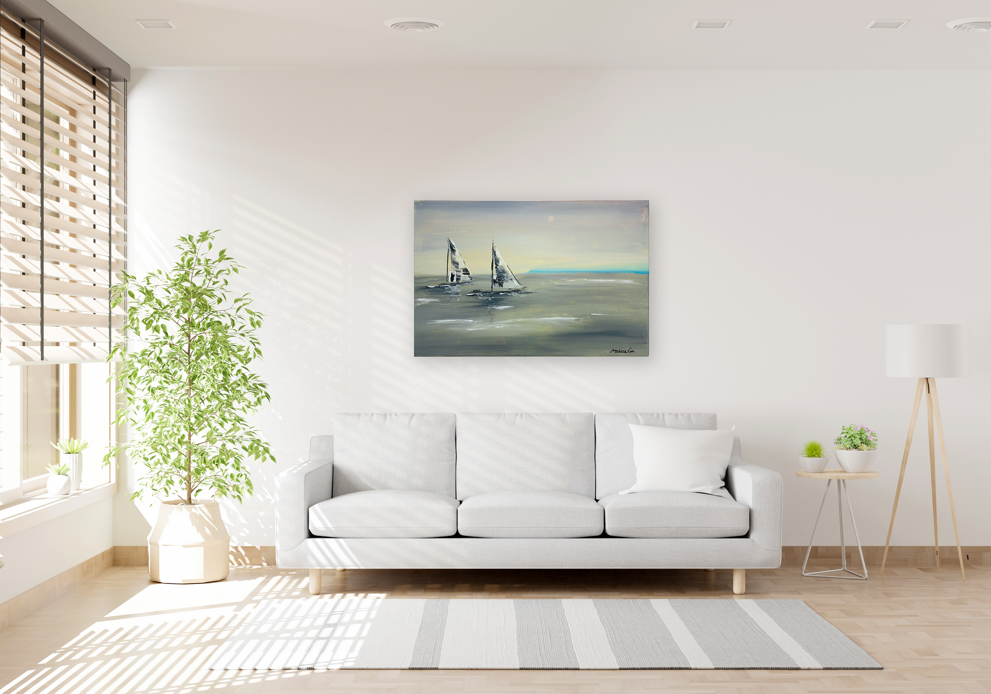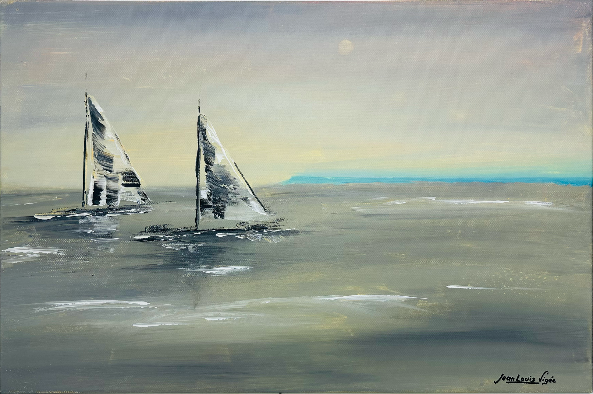 Ce tableau représente une mer d'huile où deux voiliers glissent paisiblement. Le ciel gris clair laisse entrevoir une lueur de soleil. Les voiles blanches et rayées se détachent sur le fond gris bleuté de l'eau. La ligne d'horizon marque la limite entre ciel et mer. L'artiste utilise des couleurs douces, créant une atmosphère calme. Les touches gestuelles ajoutent fluidité à l'œuvre, évoquant une journée ensoleillée invitant à la rêverie.